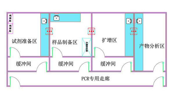 PCR實(shí)驗(yàn)室原則上為試劑準(zhǔn)備區(qū)、樣品制備區(qū)、擴(kuò)增區(qū)和擴(kuò)增產(chǎn)物分析區(qū)四個(gè)單獨(dú)的工作區(qū)域并設(shè)有專(zhuān)用走廊,各工作區(qū)域應(yīng)設(shè)緩沖間,工作區(qū)與緩沖間宜安裝連鎖裝置。不同功能的工作區(qū)應(yīng)是分隔獨(dú)立的,各工作區(qū)有明顯的標(biāo)志,不能直通。如果緊密相連,需安裝物品傳遞窗。前兩區(qū)為擴(kuò)增前區(qū),后兩區(qū)為擴(kuò)增后區(qū),擴(kuò)增前區(qū)與擴(kuò)增后區(qū)應(yīng)嚴(yán)格分開(kāi)。實(shí)驗(yàn)材料、試劑、記錄紙、筆、清潔材料等,只能從擴(kuò)增前區(qū)流向擴(kuò)增后區(qū),即從試劑準(zhǔn)備區(qū)→樣品制備區(qū)→擴(kuò)增區(qū)→擴(kuò)增產(chǎn)物分析區(qū),不得逆向流動(dòng)。實(shí)驗(yàn)室的氣流也應(yīng)從擴(kuò)增前區(qū)流向擴(kuò)增后區(qū),不得逆向流動(dòng)。各工作區(qū)頂部應(yīng)安裝紫外燈,紫外燈的波長(zhǎng)為254nm,每20㎡一支40W的紫外燈。